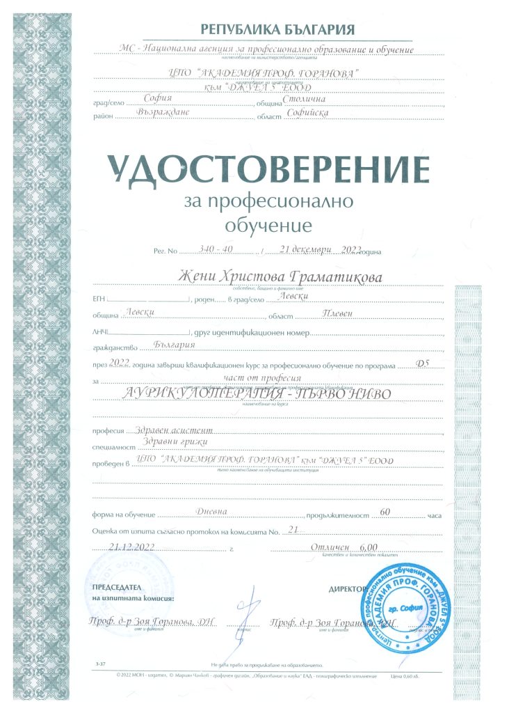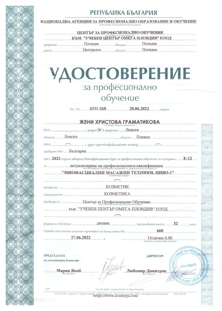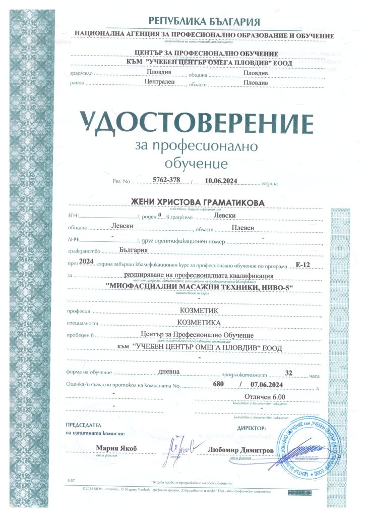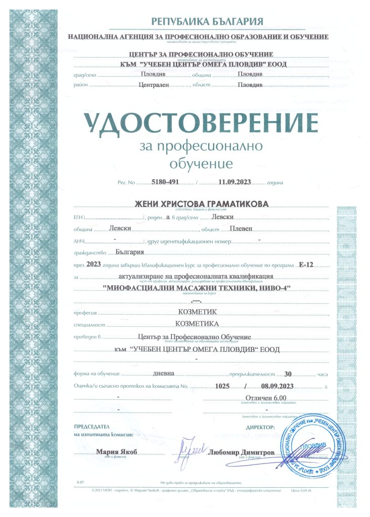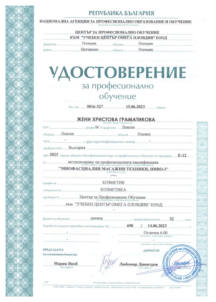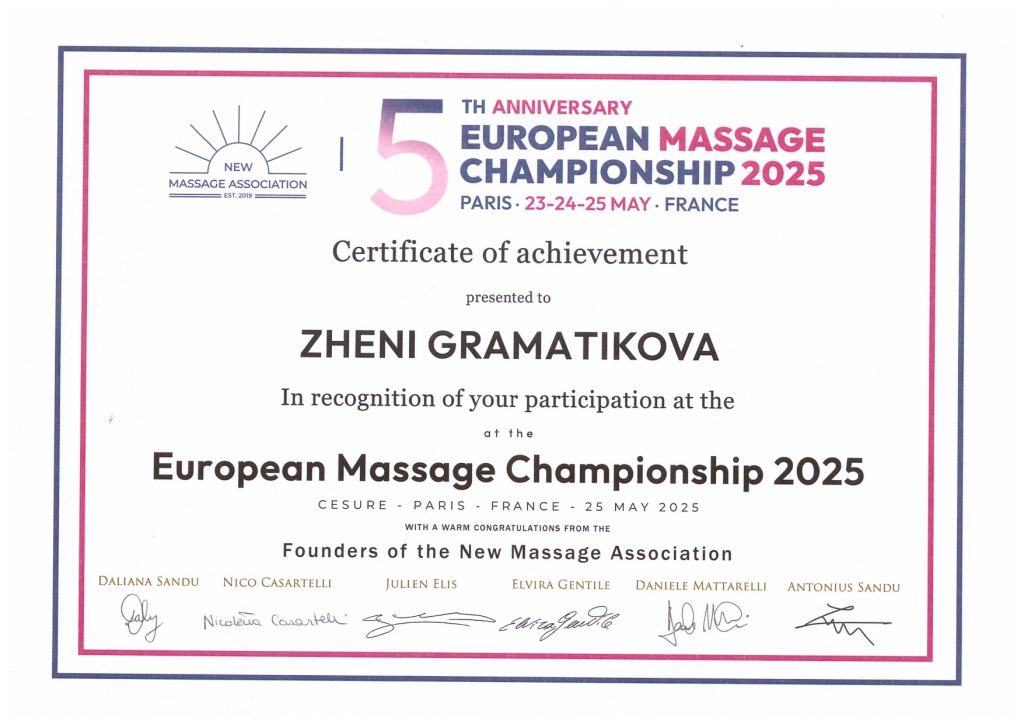 Аз съм Жени и съм квалифициран масажист терапевт. Имах възможността да се обучавам при невероятни преподаватели в Национална Спортна Академия „Васил Левски“, които ми дадоха знания за работа с човешкото тяло. Работила съм с екип от изключителни професионалисти кинезитерапевти. С тях натрупах още знания и умения, които прилагам постоянно в практиката си с различните клиенти и техните конкретни случаи. Желанието ми да се развивам и да се усъвършенствам в работата си не спира до тук и в бъдеще ще продължавам да се квалифицирам в различни направления от нашата професия.